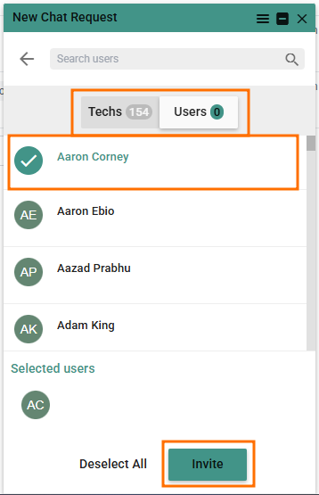 - Select whether you want to add a user or an agent, select the user you want to add, then click Invite: