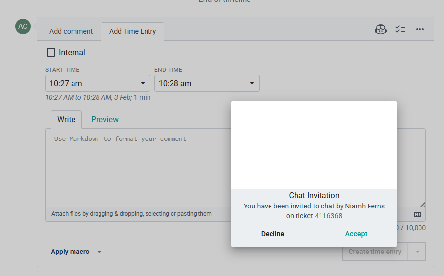 Tech members can create chat sessions for open tickets to chat with end users in real time. Chats may be opened by an agent only if the ticket has an online contact assigned.